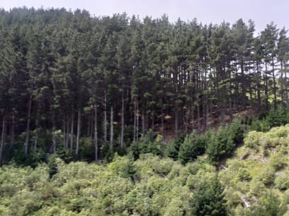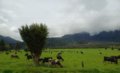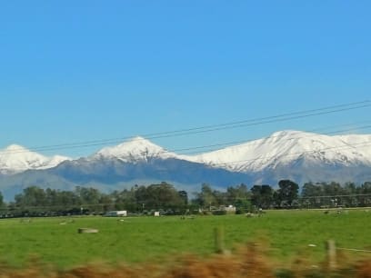Jedeme oblastí pastvin...nádherné krávy a ovce na velikých plochách...pastviny okrašlují větrolamy v podobě živých plotů z pečlivě zastřižených jehličnanů...a svítí slunce a v dálce se třpytí sníh na horách...